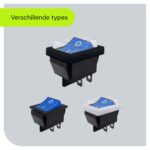 - Opties:Deze schakelaar is beschikbaar in het rood, blauw, groen, oranje en zwart. Met of zonder beschermkap en aansluitkabel.