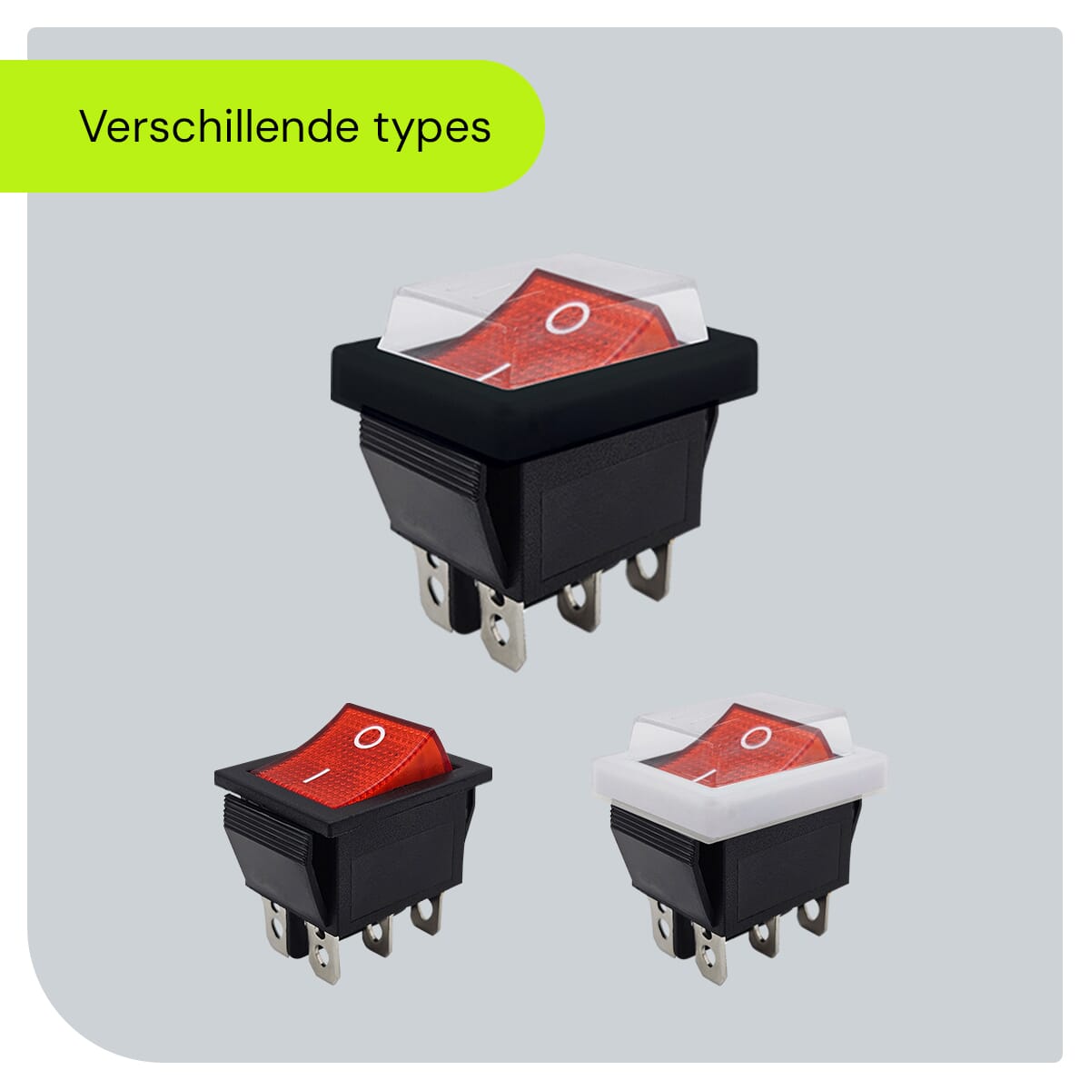 - Opties:Deze schakelaar is beschikbaar in het rood, blauw, groen, oranje en zwart. Met of zonder beschermkap en aansluitkabel.