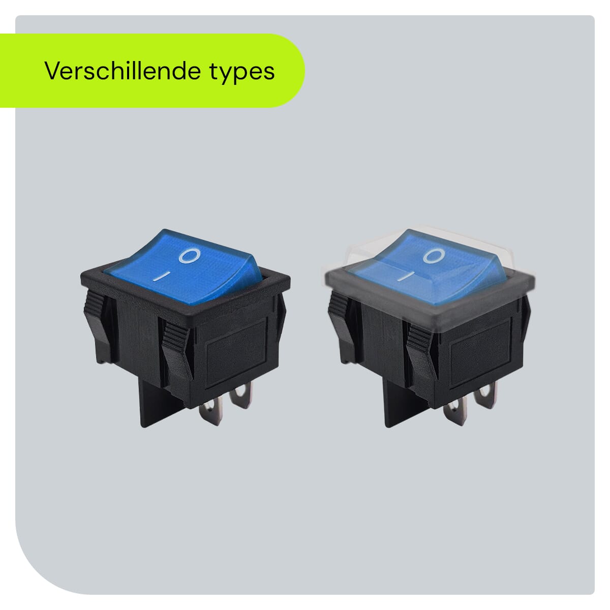 - Opties:Deze schakelaar is beschikbaar in het rood, blauw, groen, oranje en zwart. Met of zonder beschermkap en aansluitkabel.