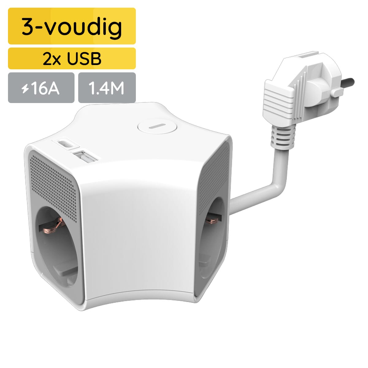 Technik Stekkerdoos Cube met USB 1.4 Meter 3-Voudig USB C en USB A Wit