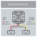 De DC-DC Converter 24V naar 12V is een spanningsomvormer die ontworpen is om een stabiele 12V uitgangsspanning te leveren vanuit een 24V voedingsbron. Dit product is ideaal voor toepassingen waarbij een lagere spanning vereist is, zoals in voertuigen of industriële systemen. Met een vermogen van 240W en een maximale stroom van 20A, biedt deze converter een betrouwbare oplossing voor het voeden van diverse elektronische apparaten.