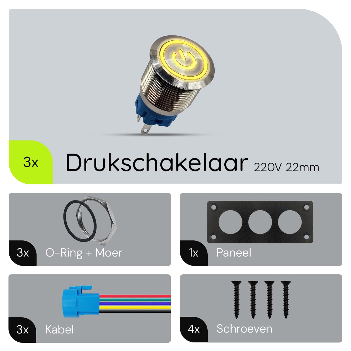 Dankzij het inbouwpaneel drievoudig ontwerp en de 22mm maat, past de ProRide drukschakelaar perfect in verschillende installaties. De meegeleverde aansluitkabels maken de integratie in je bestaande systeem eenvoudig en efficiënt.