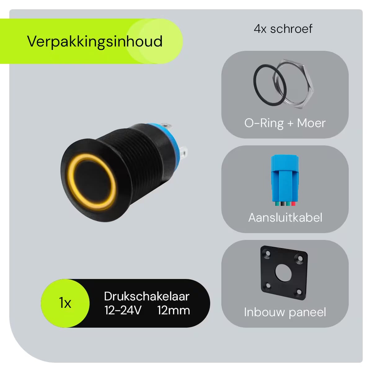 ProRide Metalen drukschakelaar Inbouw 12V ON-OFF – 12mm – Enkelvoudig inbouwpaneel met Aansluitkabel – 12V/24V – LED indicatie Geel