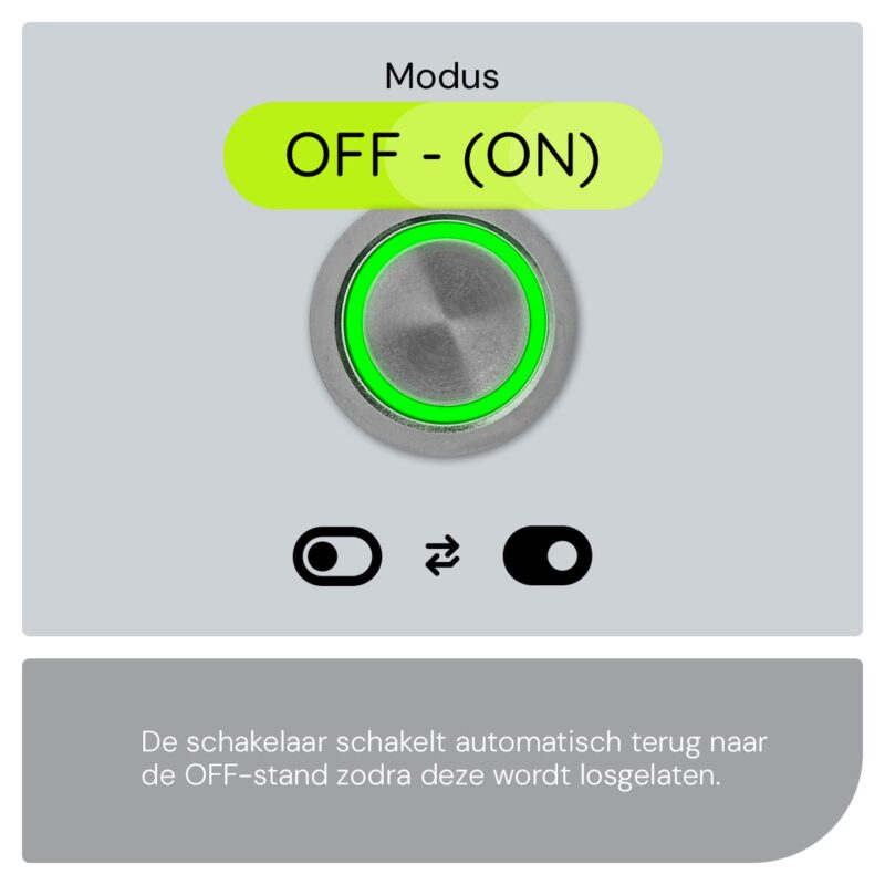 De ProRide Metalen drukschakelaar werkt op een eenvoudige ON-OFF basis. Wanneer je de schakelaar indrukt, maakt deze contact en activeert het aangesloten apparaat of systeem. De groene LED indicatie licht op om aan te geven dat de schakelaar in de ‘aan’ positie staat. Wanneer je de schakelaar opnieuw indrukt, verbreekt het contact en gaat de LED uit, wat aangeeft dat de schakelaar in de ‘uit’ positie staat.