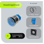 ProRide Metalen drukschakelaar Inbouw 220V ON-OFF – 19mm – Enkelvoudig inbouwpaneel met Aansluitkabel – LED indicatie Blauw