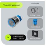 ProRide Metalen drukschakelaar Inbouw 220V ON-OFF – 19mm – Enkelvoudig inbouwpaneel met Aansluitkabel – LED indicatie Blauw
