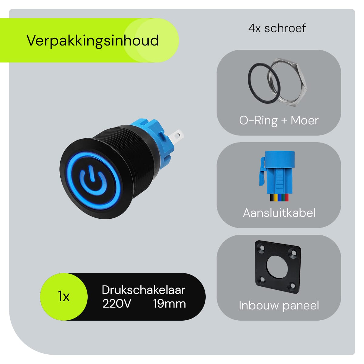 ProRide Metalen drukschakelaar Inbouw 220V ON-OFF – 19mm – Enkelvoudig inbouwpaneel met Aansluitkabel – LED indicatie Blauw