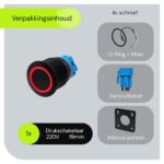 ProRide Metalen drukschakelaar Inbouw 220V ON-OFF – 19mm – Enkelvoudig inbouwpaneel met Aansluitkabel – LED indicatie Rood