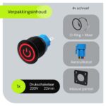 ProRide Metalen drukschakelaar Inbouw 220V ON-OFF – 22mm – Enkelvoudig inbouwpaneel met Aansluitkabel – LED indicatie Rood