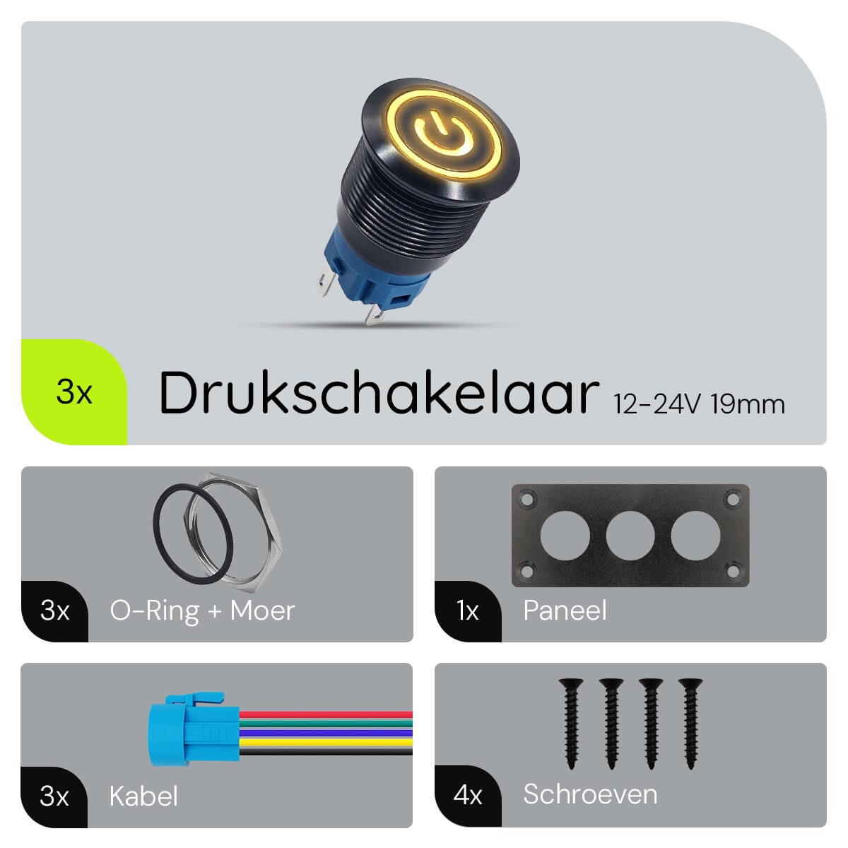 Het ProRide Inbouwpaneel is eenvoudig te installeren dankzij de meegeleverde aansluitkabels. Sluit de kabels aan op je stroombron en geniet van de betrouwbare werking van de drukschakelaars. De gele LED-indicatie laat je direct zien of de schakelaars aan of uit staan.