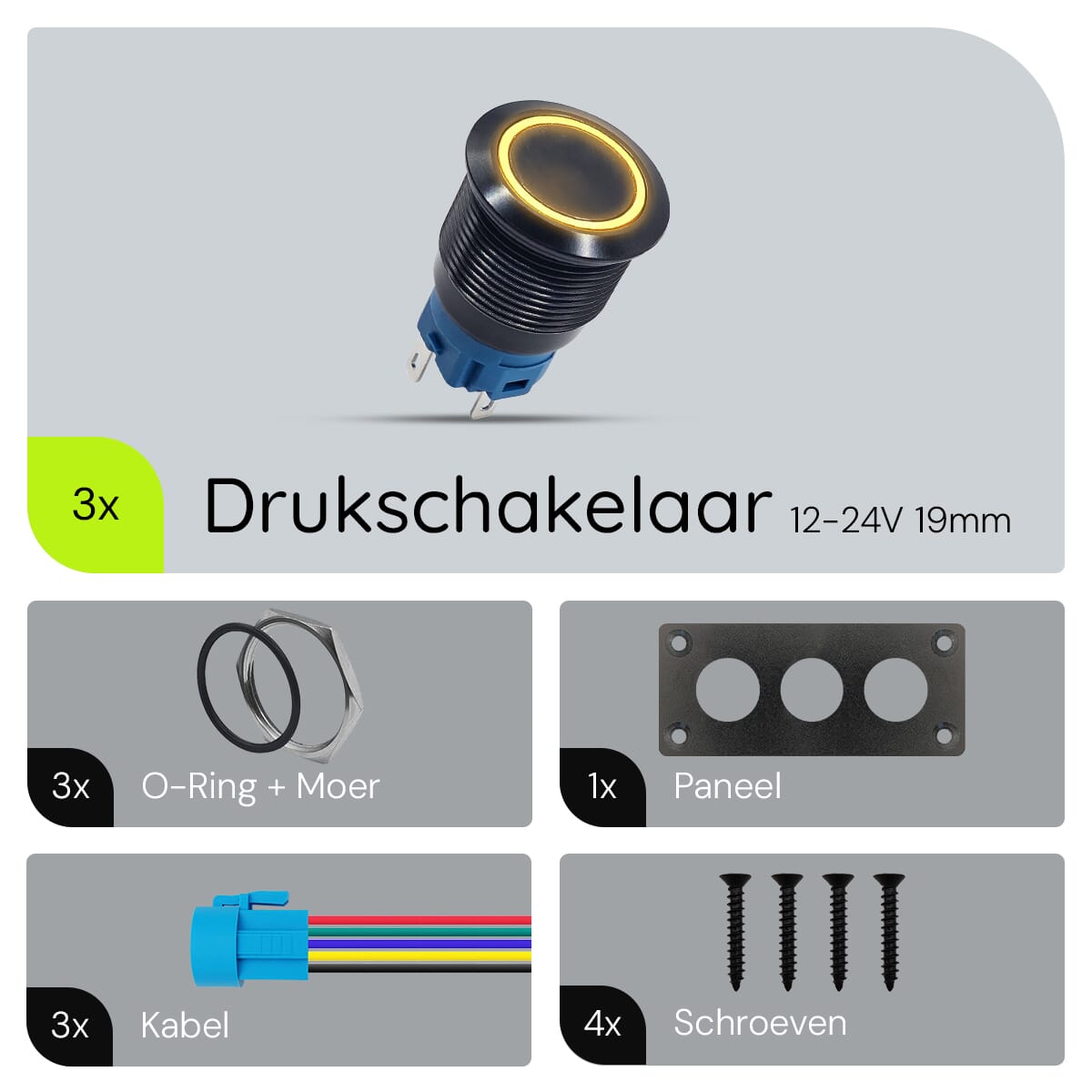 Het ProRide Inbouwpaneel is eenvoudig te installeren dankzij de meegeleverde aansluitkabels. Sluit de kabels aan op je stroombron en geniet van de betrouwbare werking van de drukschakelaars. De gele LED-indicatie laat je direct zien of de schakelaars aan of uit staan.