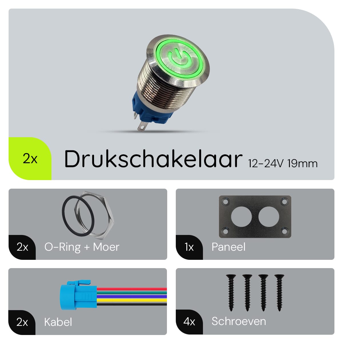 - Hoe groot zijn de drukschakelaars? De drukschakelaars hebben een diameter van 19mm.