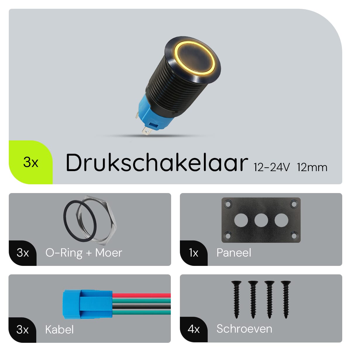 ProRide Metalen Drukschakelaars ON-OFF 12-24V – 12mm – Drievoudig inbouwpaneel – IP67 – LED indicatie Geel