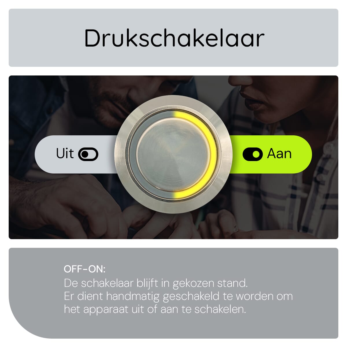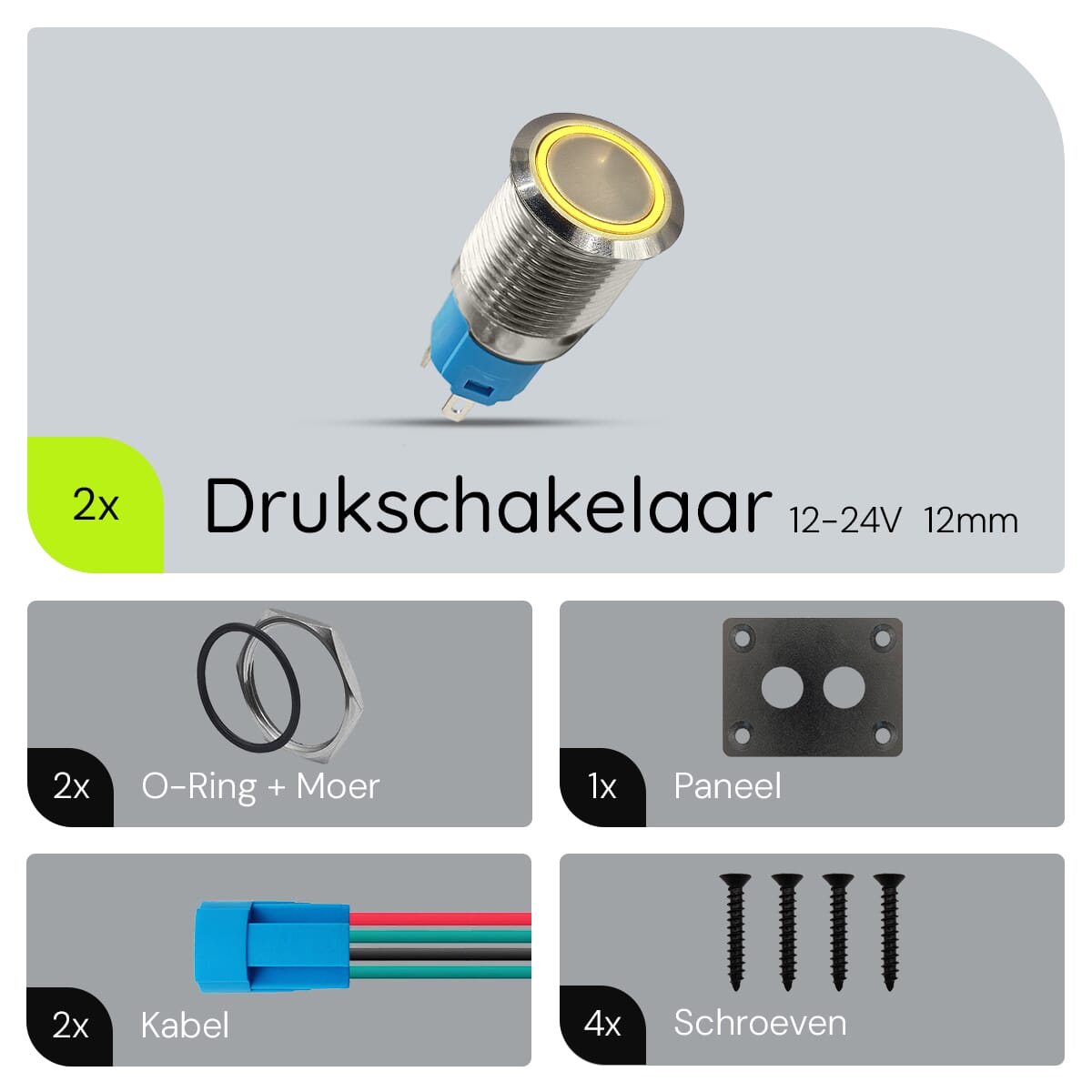 ProRide Metalen Drukschakelaars ON-OFF 12-24V – 12mm – tweevoudig inbouwpaneel – IP67 – LED indicatie Geel