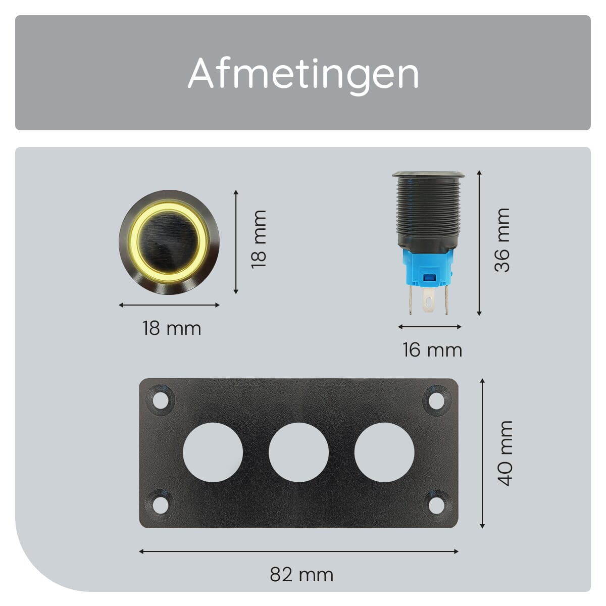 ProRide Metalen Drukschakelaars ON-OFF 12-24V – 16mm – Drievoudig inbouwpaneel – IP67 – LED indicatie Geel