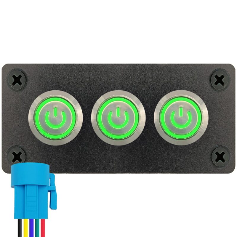 Transformeer je voertuig of project met het ProRide Inbouwpaneel, uitgerust met drievoudige metalen drukschakelaars. Deze hoogwaardige schakelaars bieden niet alleen functionaliteit, maar ook een stijlvolle uitstraling dankzij de zilveren afwerking en groene LED-indicatie. Perfect voor elke klus waarbij betrouwbaarheid en design hand in hand gaan.