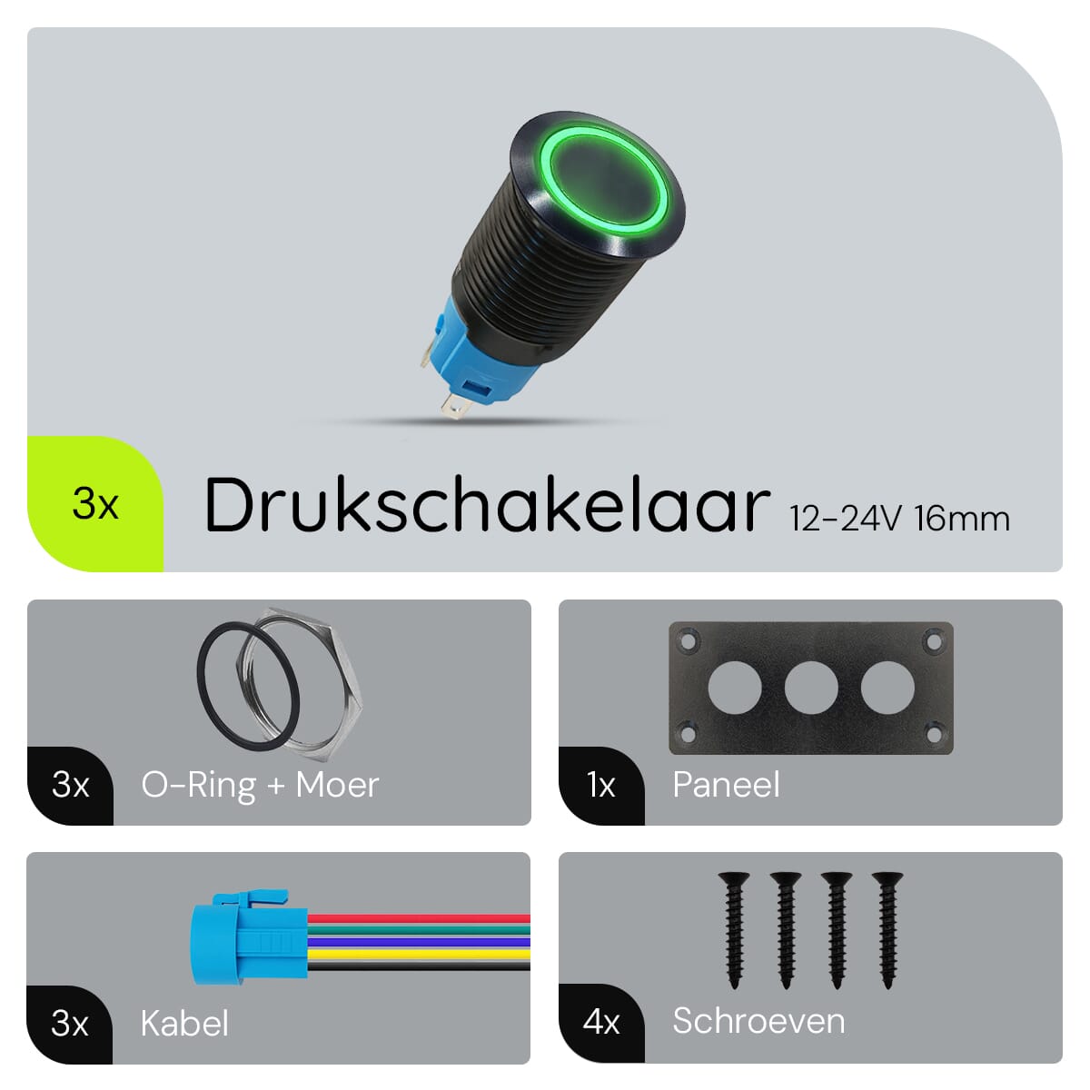 - Hoeveel schakelaars bevat het paneel? Het paneel bevat drie metalen drukschakelaars.