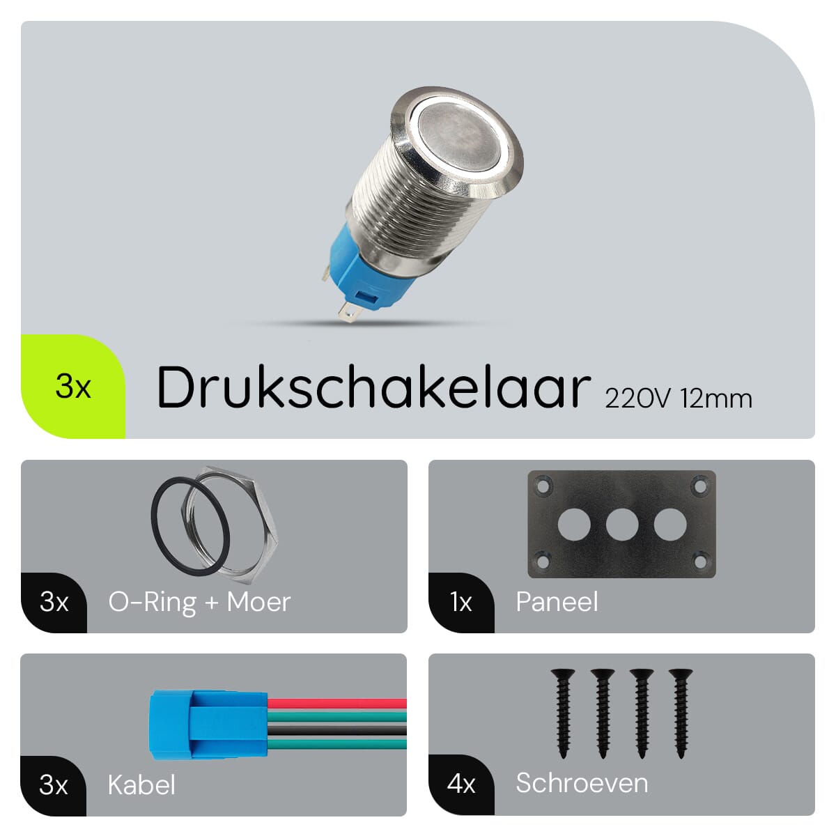 - Wat is de diameter van de drukschakelaars? De drukschakelaars hebben een diameter van 12mm.