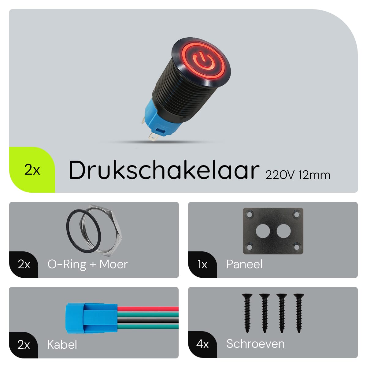 - Welke afmetingen heeft de schakelaar? De schakelaar heeft een diameter van 12mm.