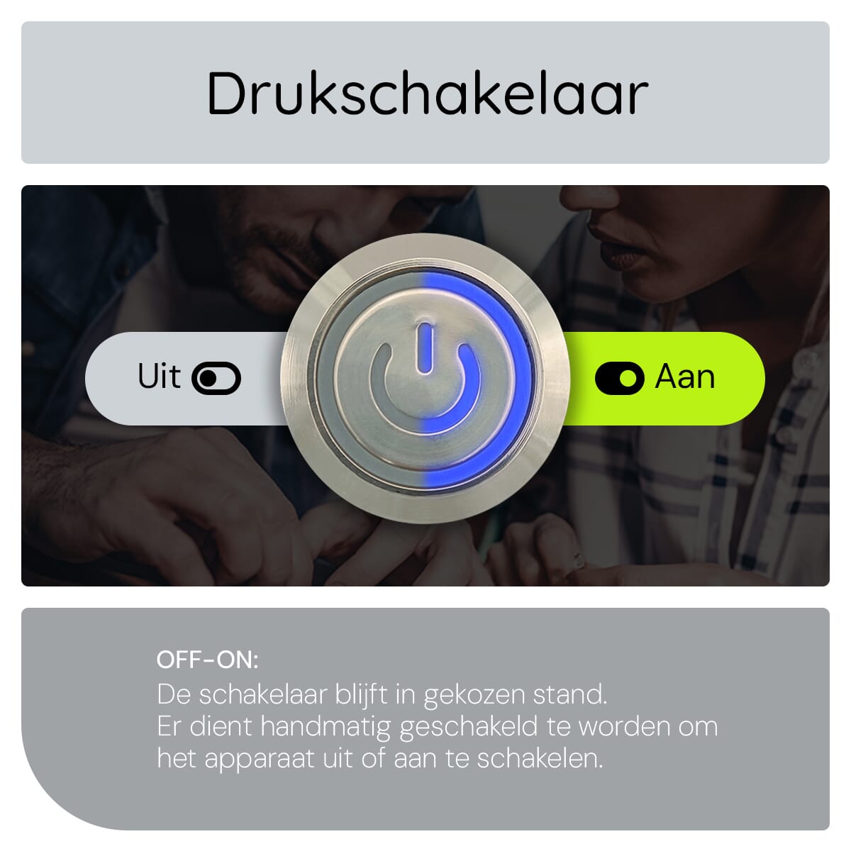 - Wat is de diameter van de drukschakelaars? De drukschakelaars hebben een diameter van 16mm.