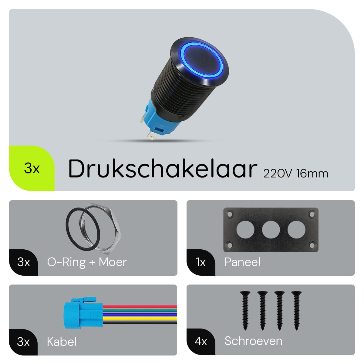 - Wat is de diameter van de drukschakelaars? De drukschakelaars hebben een diameter van 16mm.