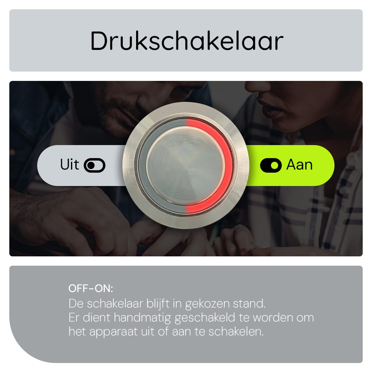 - Wat is de diameter van de drukschakelaars? De drukschakelaars hebben een diameter van 16mm.