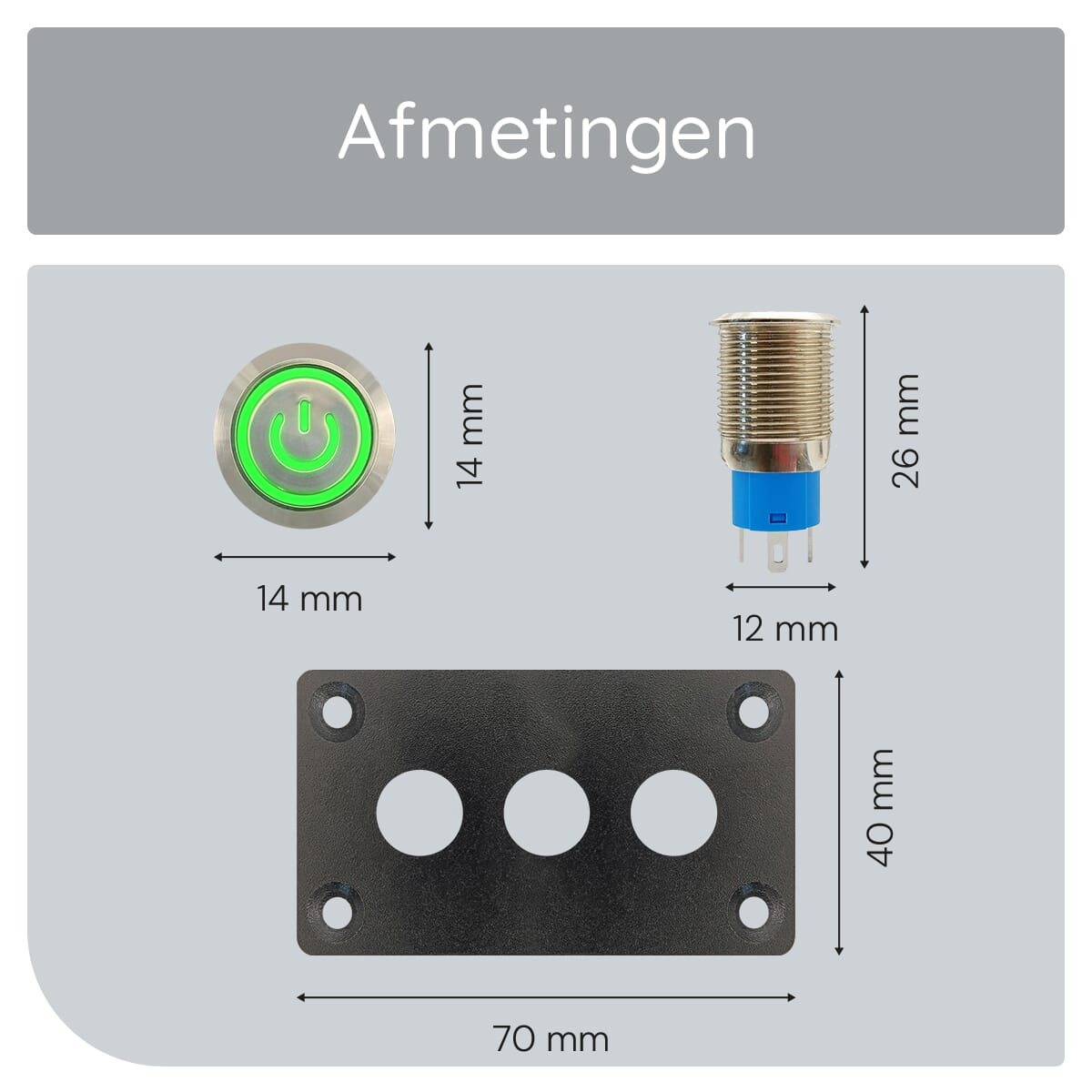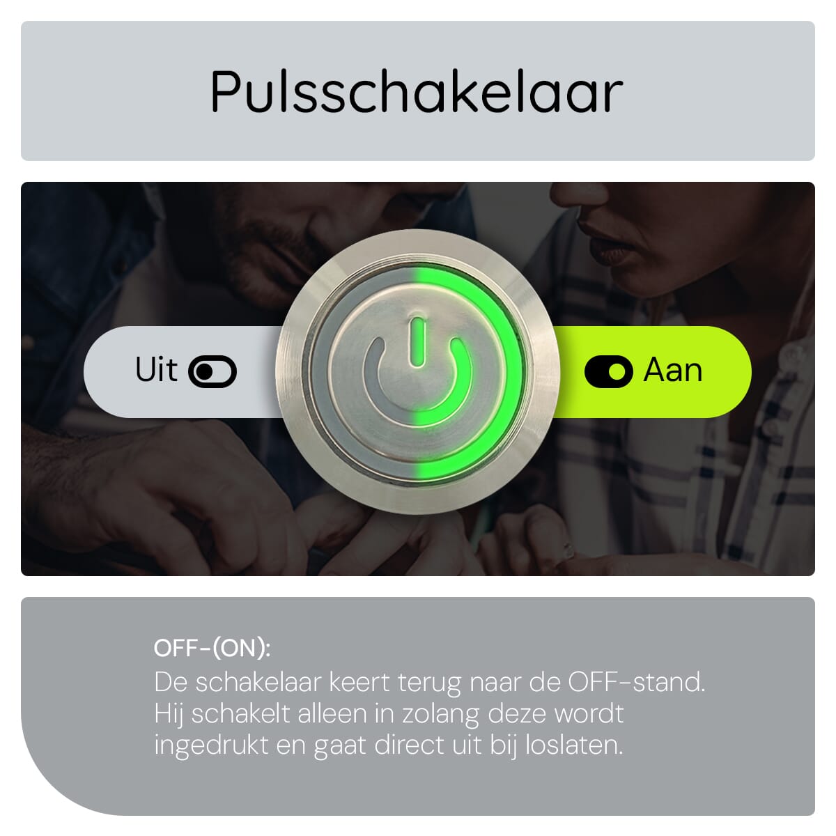 - Schakelaar: Metalen pulsschakelaar, 12mm