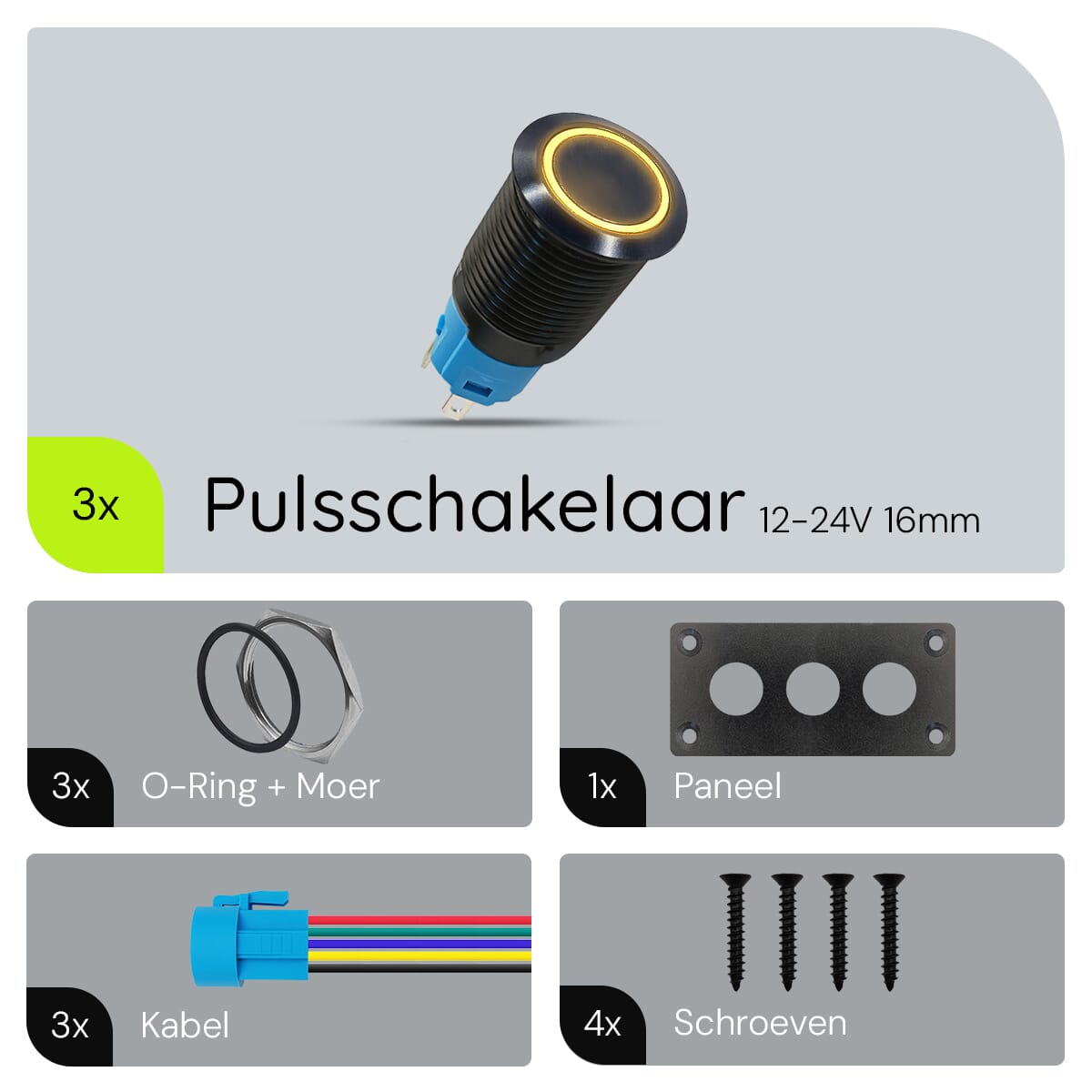 Het ProRide Inbouwpaneel is eenvoudig te installeren en te gebruiken. Sluit de meegeleverde kabels aan op je stroombron en apparaten, en gebruik de metalen pulsschakelaars om je apparaten aan of uit te zetten. De gele LED-indicatie laat je weten wanneer een schakelaar actief is.