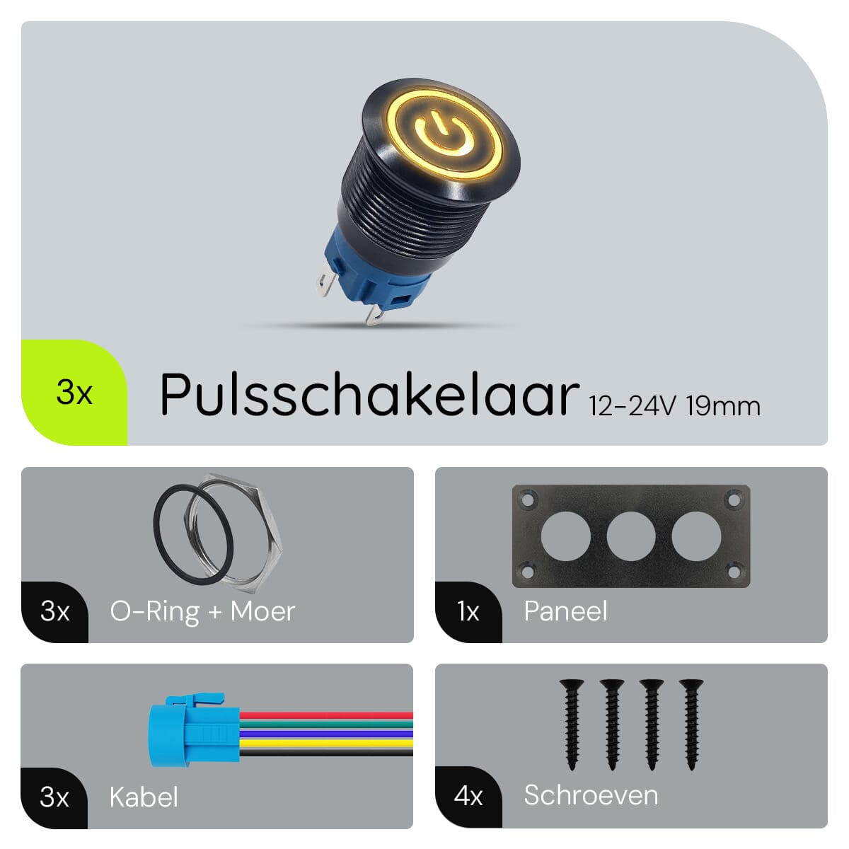 Het ProRide Inbouwpaneel is eenvoudig te installeren en te gebruiken. Sluit de meegeleverde kabels aan op je stroombron en apparaten, en gebruik de metalen pulsschakelaars om je apparaten aan of uit te zetten. De gele LED-indicatie laat je weten wanneer een schakelaar actief is.