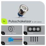 ProRide Metalen pulsschakelaar 12-24V OFF-(ON) – Inbouwpaneel drievoudig – 22mm – IP67 – LED indicatie Wit
