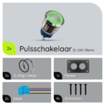 De zilveren momentschakelaar van 19mm biedt een stevige en betrouwbare bediening. De metalen constructie zorgt voor duurzaamheid, terwijl de groene LED-indicatie een moderne touch toevoegt.