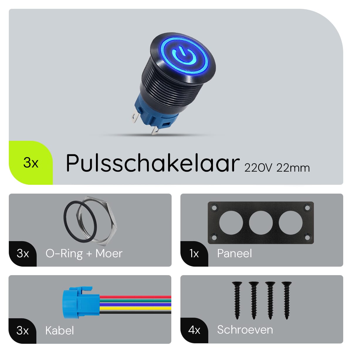 De ProRide metalen pulsschakelaar werkt op 220V en is ontworpen voor inbouw in een drievoudig paneel. De schakelaar heeft een OFF-(ON) functie, wat betekent dat hij alleen actief is wanneer hij ingedrukt wordt. De blauwe LED-indicatie geeft aan wanneer de schakelaar actief is.
