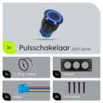 De ProRide metalen pulsschakelaar werkt op 220V en is ontworpen voor inbouw in een drievoudig paneel. De schakelaar heeft een OFF-(ON) functie, wat betekent dat hij alleen actief is wanneer hij ingedrukt wordt. De blauwe LED-indicatie geeft aan wanneer de schakelaar actief is.