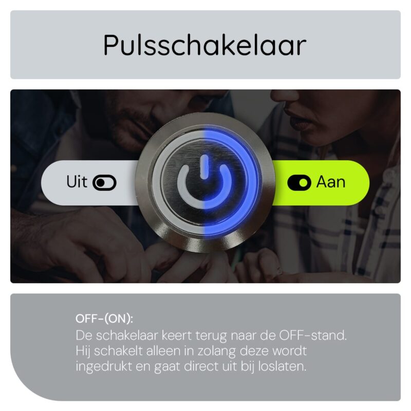 De ProRide pulsschakelaar werkt op een eenvoudige OFF-(ON) basis, wat betekent dat de schakelaar alleen actief is wanneer deze ingedrukt wordt. Dit maakt het ideaal voor toepassingen waar tijdelijke activering gewenst is.