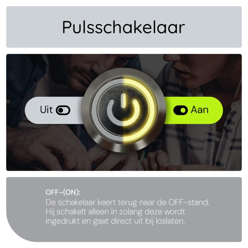 De ProRide metalen pulsschakelaar werkt door een eenvoudige druk op de knop, waarbij de schakelaar tijdelijk contact maakt. Dit maakt hem ideaal voor toepassingen waar een momentane actie vereist is. De schakelaar is eenvoudig te installeren dankzij de meegeleverde aansluitkabels.
