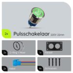 - Hoe groot is de schakelaar? De schakelaar heeft een diameter van 22mm, wat hem geschikt maakt voor standaard inbouwpanelen.