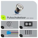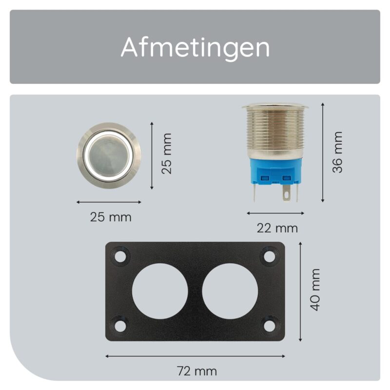 - Wat is de diameter van de schakelaar? De schakelaar heeft een diameter van 22mm, wat zorgt voor een perfecte pasvorm in standaard inbouwpanelen.
