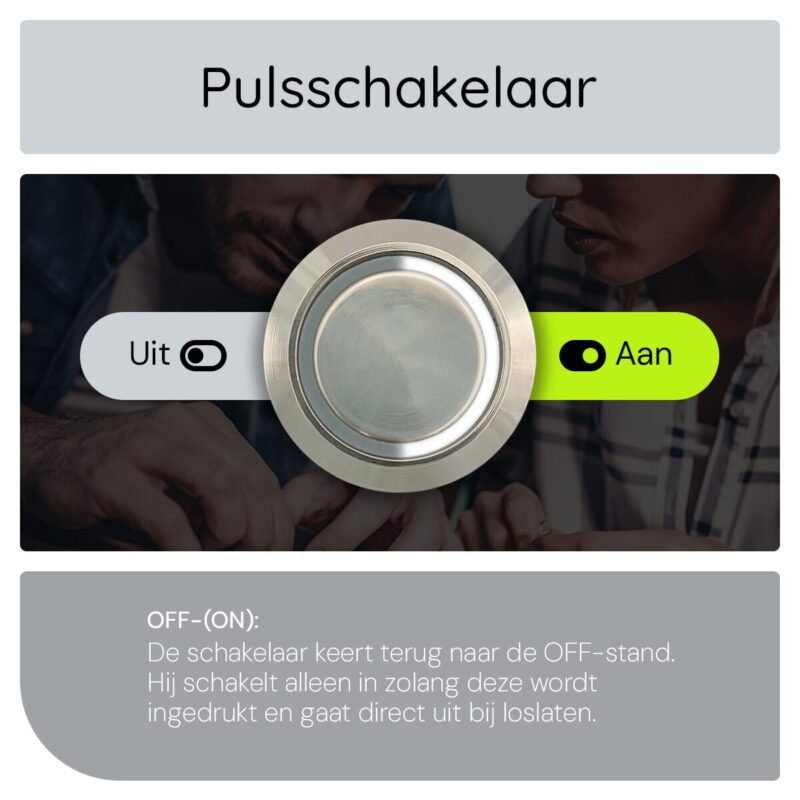 De ProRide metalen pulsschakelaar werkt op een eenvoudige OFF-(ON) basis, wat betekent dat de schakelaar alleen actief is wanneer deze wordt ingedrukt. Dit maakt het ideaal voor toepassingen waar tijdelijke activering nodig is.