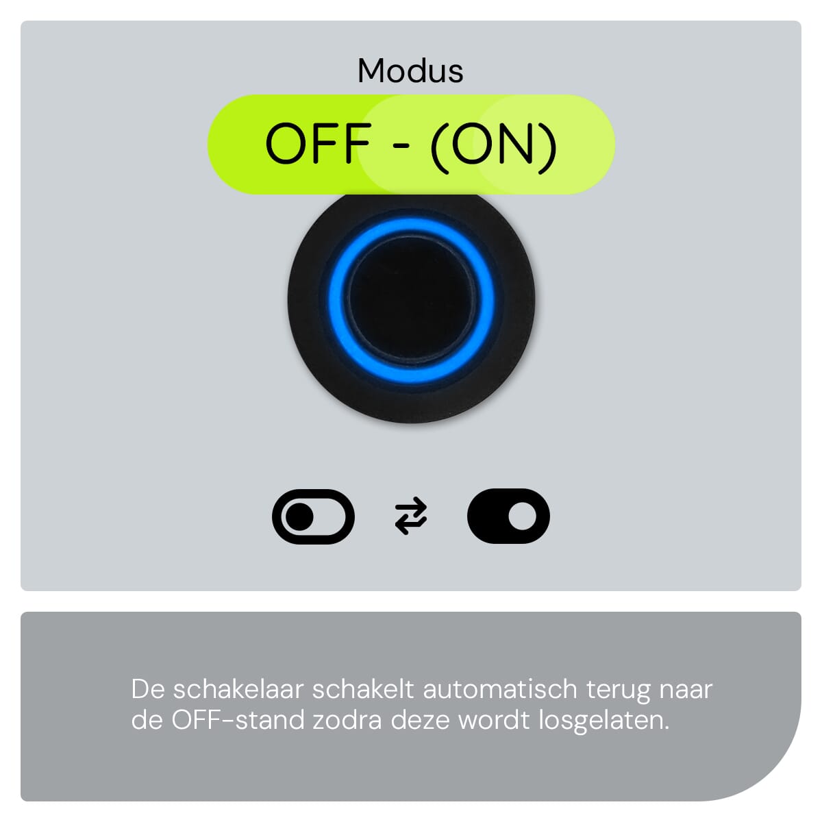 ProRide Metalen Pulsschakelaar Inbouw 12V OFF-(ON) – 12mm – Momentschakelaar met Enkelvoudig Inbouwpaneel en Aansluitkabel – Spatwaterdicht – 12V/24V – LED Indicatie Blauw