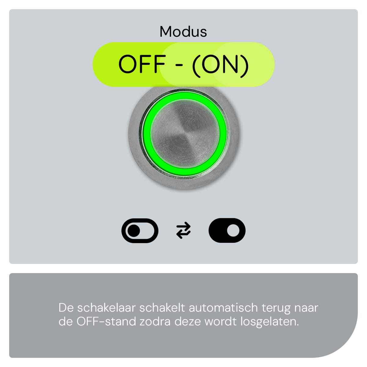 De ProRide Metalen pulsschakelaar werkt op een eenvoudige OFF-(ON) basis. Dit betekent dat de schakelaar alleen actief is wanneer je hem indrukt. Zodra je de knop loslaat, keert hij terug naar de uit-stand. De groene LED-indicatie licht op wanneer de schakelaar ingedrukt is, zodat je altijd weet wanneer hij actief is.