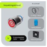 ProRide Metalen pulsschakelaar Inbouw 220V OFF-(ON) – 12mm – Momentschakelaar met Enkelvoudig inbouwpaneel en Aansluitkabel – Spatwaterdicht – LED indicatie Rood
