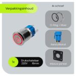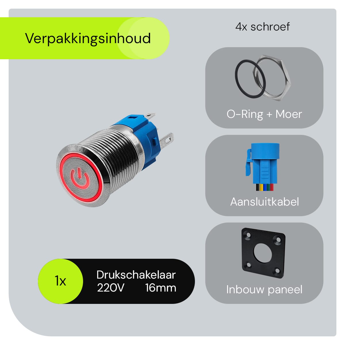ProRide Metalen pulsschakelaar Inbouw 220V OFF-(ON) – 16mm – Momentschakelaar met Enkelvoudig inbouwpaneel en Aansluitkabel – Spatwaterdicht – LED indicatie Rood