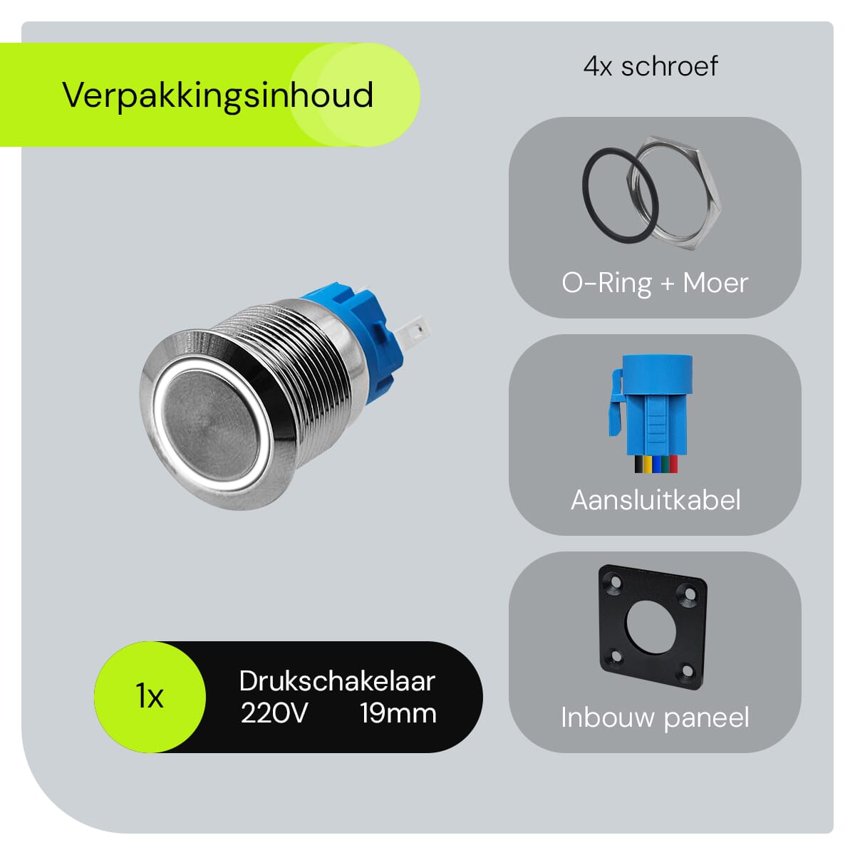 ProRide Metalen pulsschakelaar Inbouw 220V OFF-(ON) – 19mm – Momentschakelaar met Enkelvoudig inbouwpaneel en Aansluitkabel – Spatwaterdicht – LED indicatie Wit