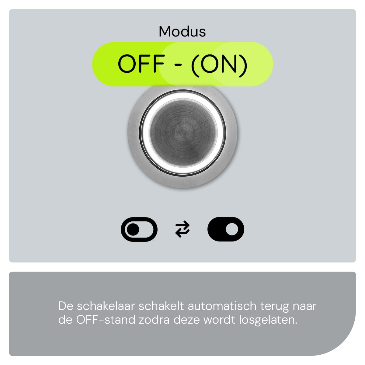 De ProRide Metalen pulsschakelaar werkt op een eenvoudige OFF-(ON) basis. Dit betekent dat de schakelaar alleen actief is wanneer je erop drukt. Zodra je de knop loslaat, keert deze terug naar de uit-stand. De witte LED-indicatie licht op wanneer de schakelaar wordt ingedrukt, zodat je altijd weet wanneer de schakelaar actief is.