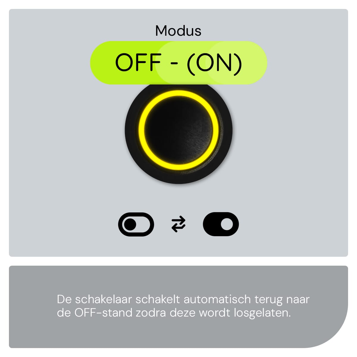 De ProRide Metalen pulsschakelaar werkt op een eenvoudige OFF-(ON) basis. Dit betekent dat de schakelaar normaal gesproken in de ‘uit’ positie staat en alleen ‘aan’ gaat wanneer je erop drukt. De gele LED-indicatie licht op wanneer de schakelaar wordt ingedrukt, zodat je direct visuele feedback krijgt.