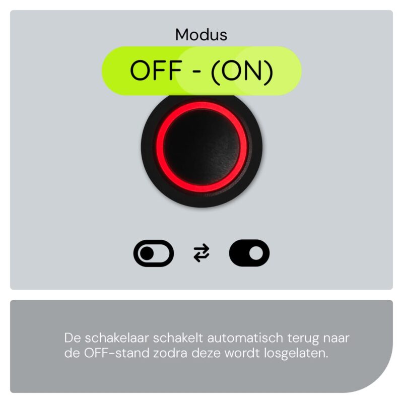 De ProRide Metalen pulsschakelaar werkt op een eenvoudige OFF-(ON) basis, wat betekent dat de schakelaar alleen actief is wanneer je erop drukt. Zodra je de druk loslaat, keert de schakelaar terug naar de uit-stand. Dit maakt het ideaal voor toepassingen waar tijdelijke activering nodig is, zoals deurbelknoppen of resetknoppen.
