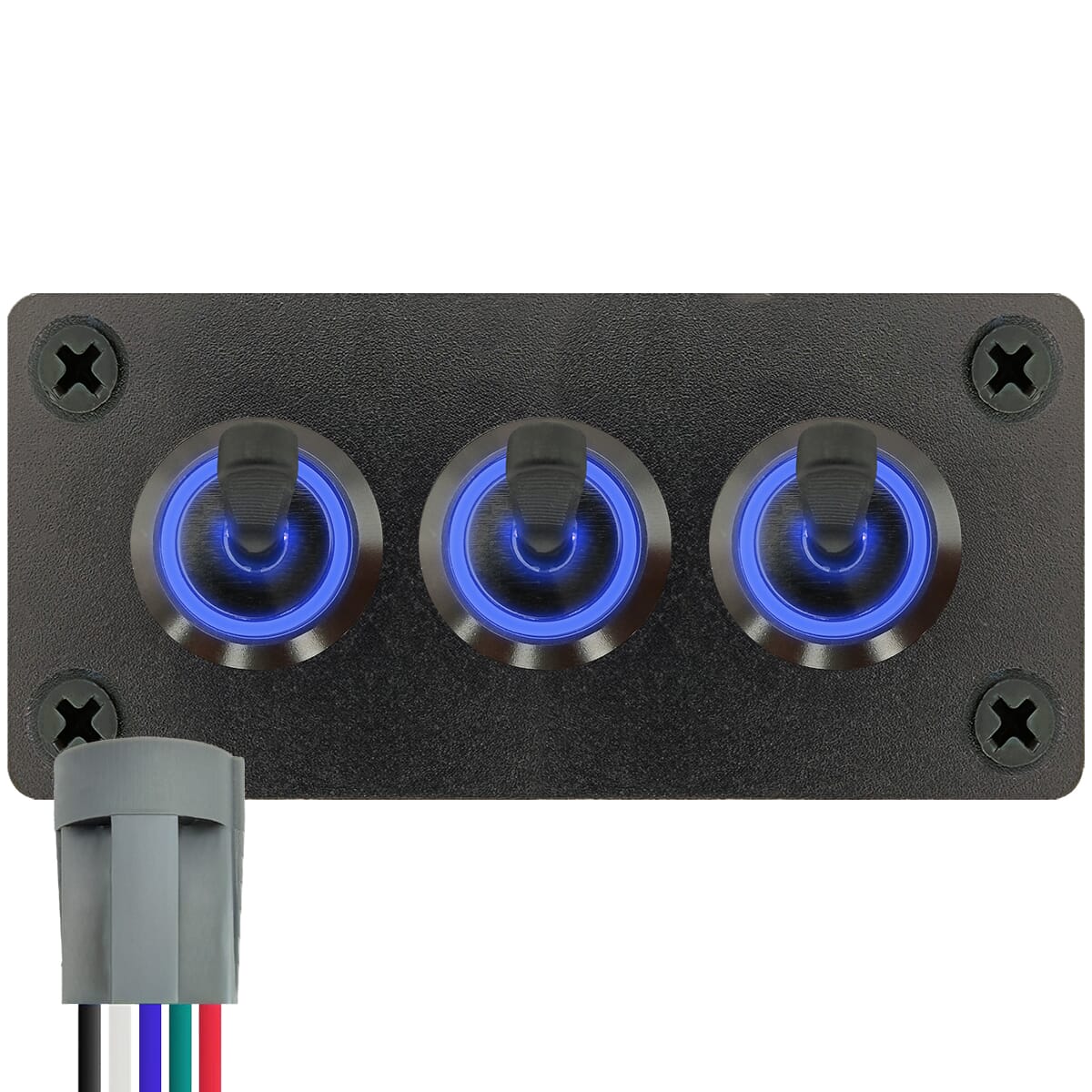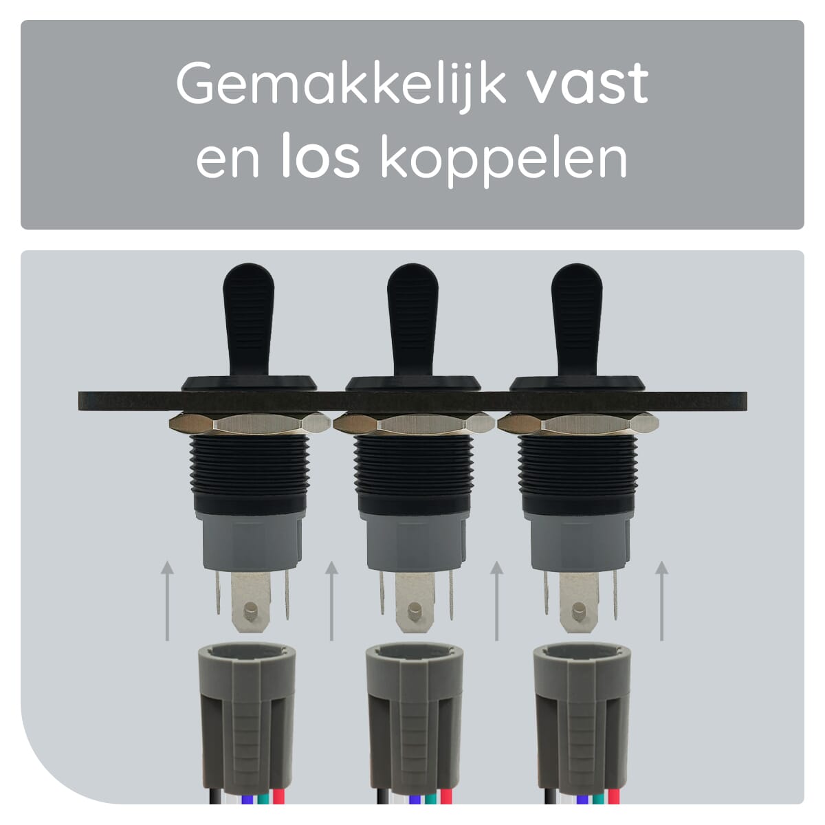 De ProRide tuimelschakelaar wordt geleverd met een drievoudig inbouwpaneel, waardoor het eenvoudig is om meerdere schakelaars naast elkaar te installeren. Dit paneel biedt een georganiseerde en nette oplossing voor het beheren van verschillende elektrische circuits in voertuigen of andere installaties.