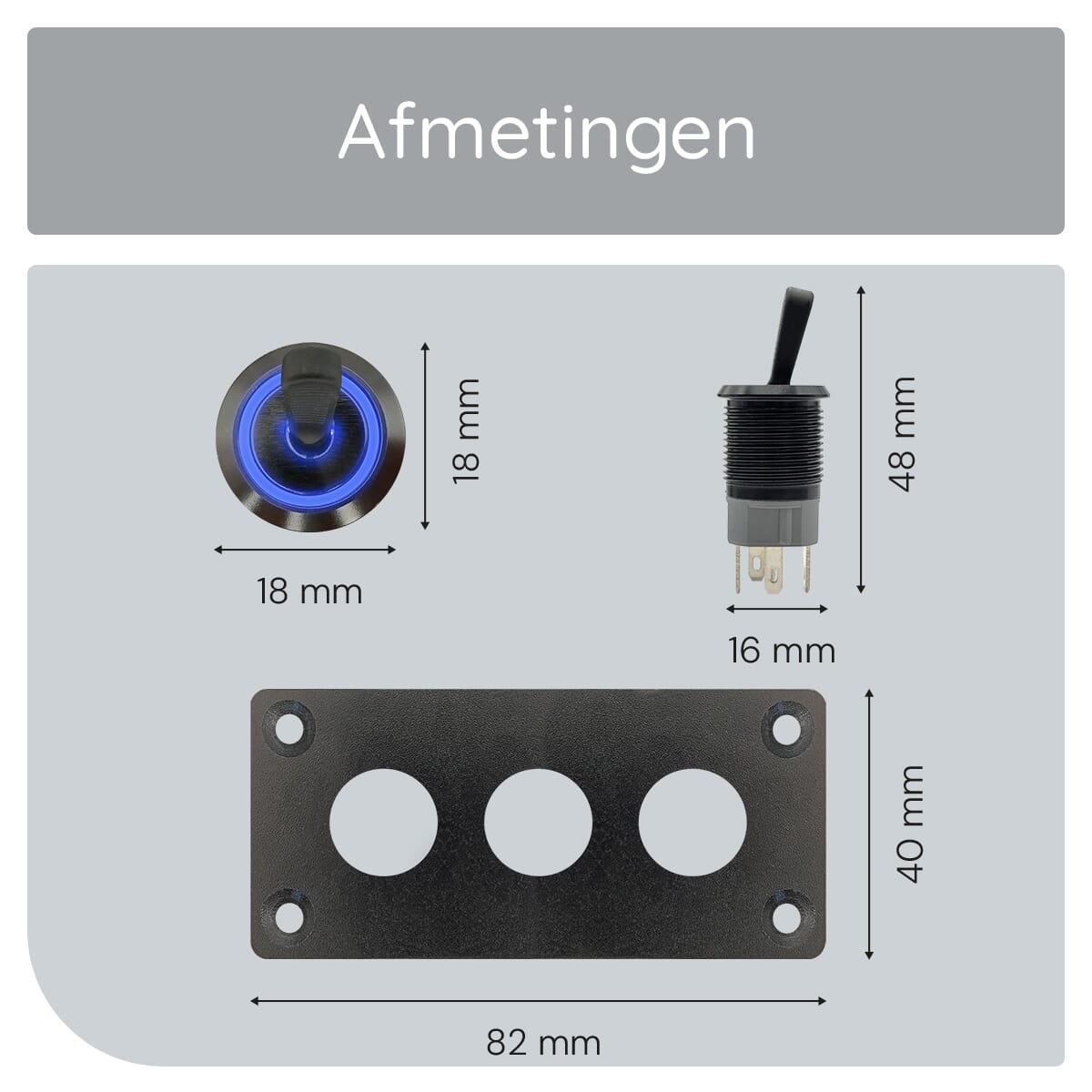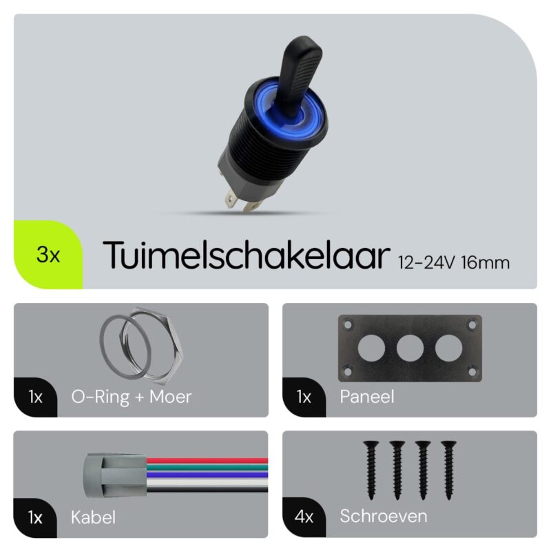 ProRide Metalen Tuimelschakelaar 12-24V OFF-ON – Drievoudig Inbouwpaneel – 16mm – LED indicatie Blauw
