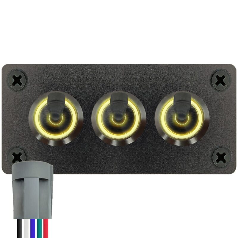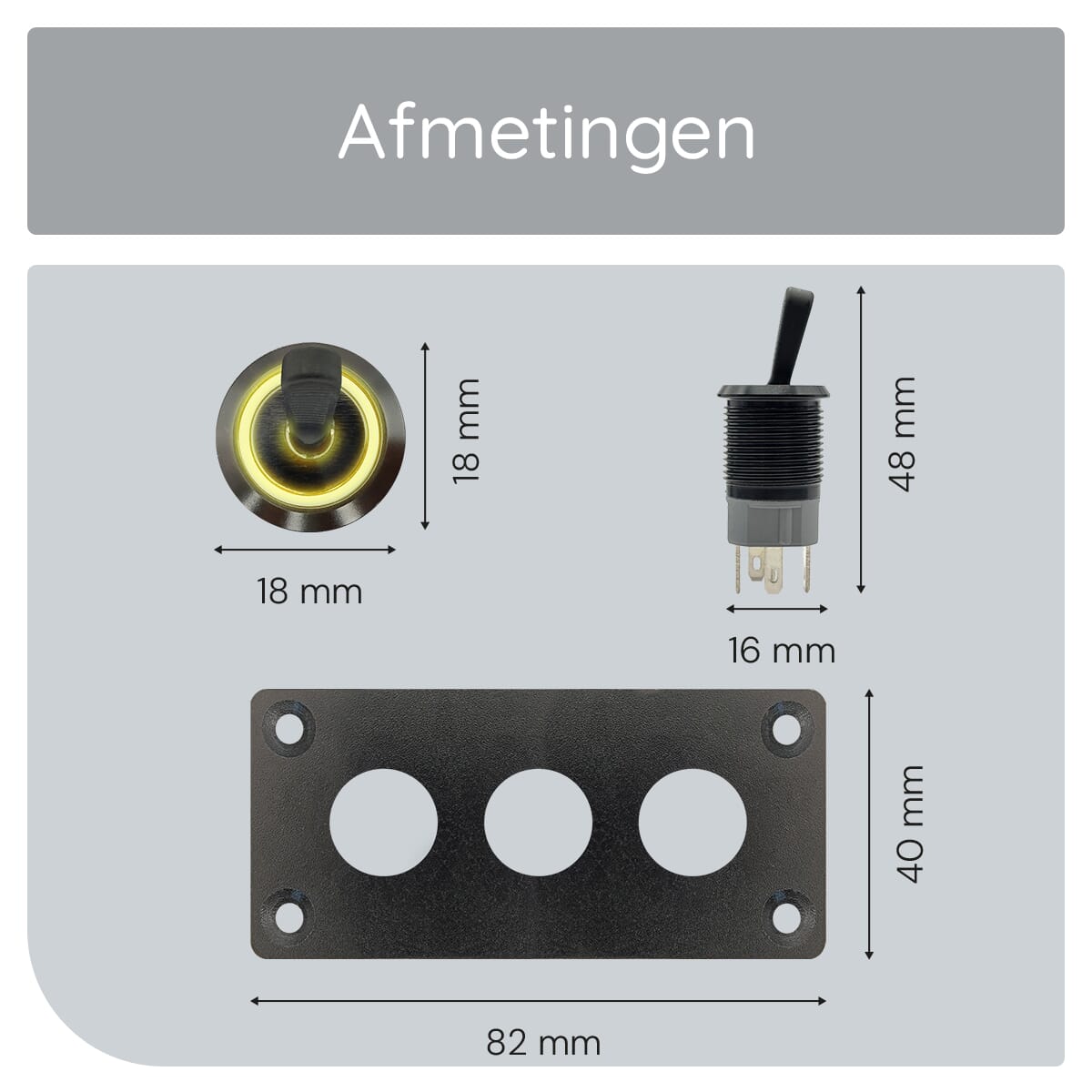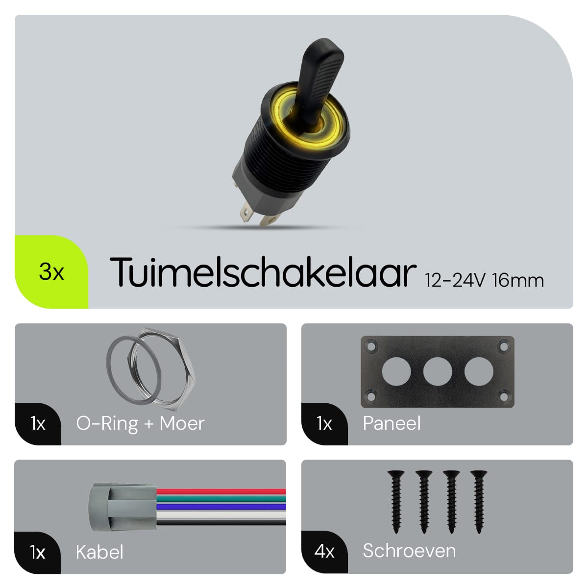 ProRide Metalen Tuimelschakelaar 12-24V OFF-ON – Drievoudig Inbouwpaneel – 16mm – LED indicatie Geel