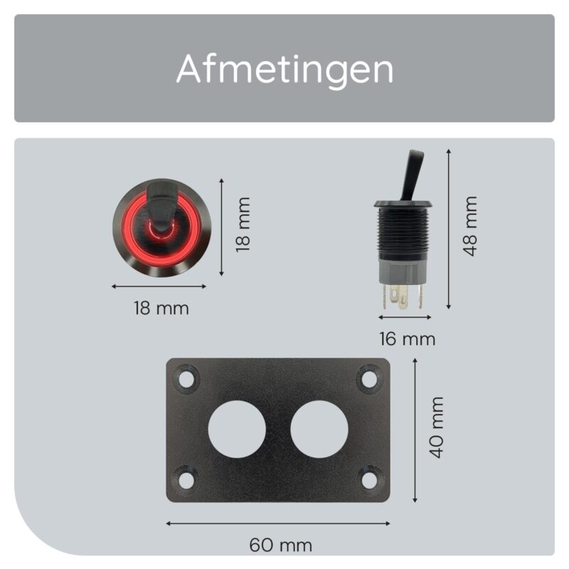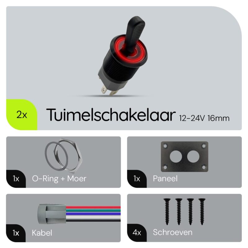 ProRide Metalen Tuimelschakelaar 12-24V OFF-ON – Tweevoudig Inbouwpaneel – 16mm – LED indicatie Rood